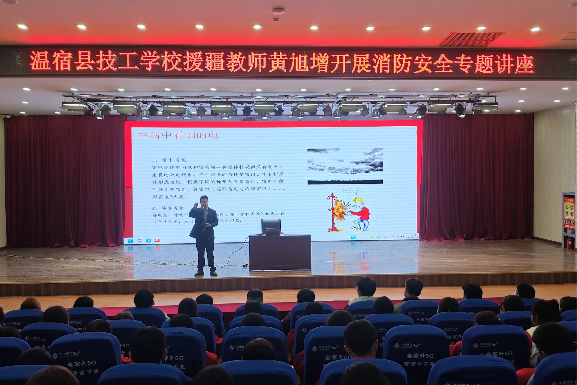 黄旭增副主任聚焦实训室用电安全核心,以消防安全为重点开展专题讲座。他结合实训室电气设备运行特性,围绕用电安全风险隐患排查、电气火灾成因、预防管控措施及应急处置全流程系统授课,重点强调实训设备接地规范、线路日常巡检要点、漏电保护器规范使用等关键要求;结合校园及行业典型电气安全事故案例,深刻剖析违规用电、操作失范引发安全事故的严重危害,以案为鉴警示全体师生时刻绷紧安全之弦,牢固树立“安全第一、预防为主、防消结合”的思想理念。