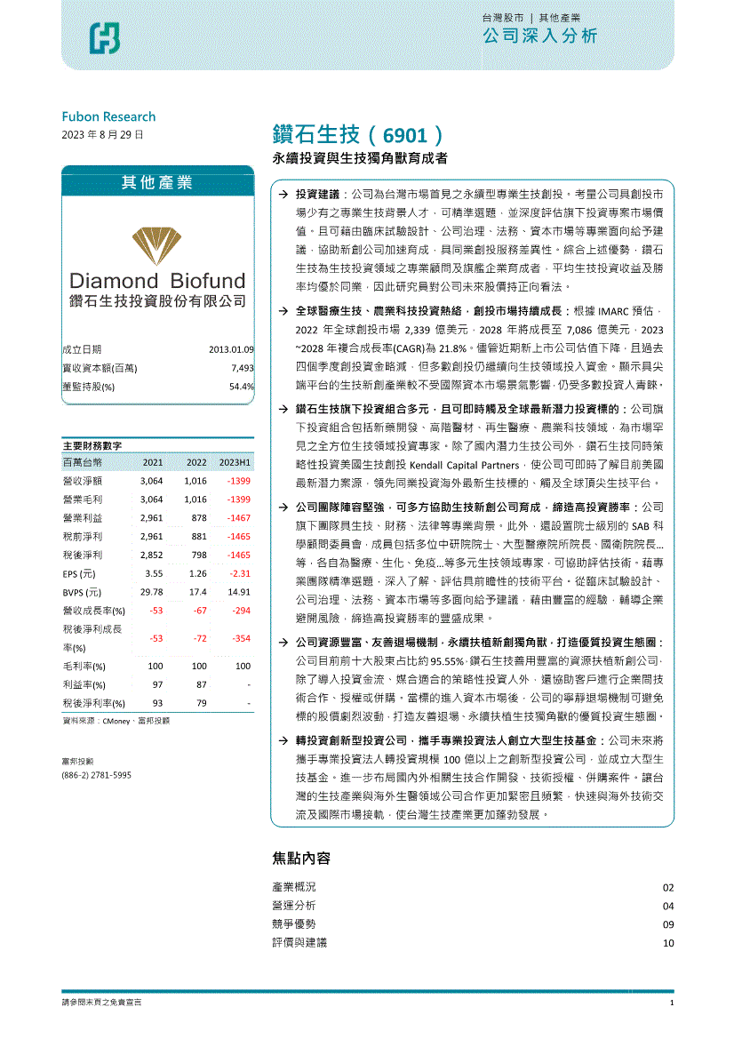 台灣股市其他產業公司深入分析 請參閱末頁之免責宣言1 Fubon Research 2023年8月29日主要財務數字百萬台幣3H1 營收淨額3,0641,016 -1399 營業毛利3,0641,016 -1399 營業利益2,961878 -1467 稅前淨利 2,961881 -1465 稅後淨利2,852798 -1465 EPS (元) 3.551.26 -2.31 BVPS (元) 29.7817.414.91 營收成長率(%) -53 -67 -294 稅後淨利成長率(%) -53 -72 -354 毛利率(%) 100100100 利益率(%) 9787 - 稅後淨利率(%) 9379 - 資料來源:CMoney、富邦投顧 富邦投顧(886-2) 2781-5995 鑽石生技(6901) 永續投資與生技獨角獸育成者焦點內容產業概況02 營運分析04 競爭優勢09 評價與建議 10 其他產業 成立日期2013.01.09 實收資本額(百萬) 7,493 董監持股(%) 54.4% →投資建議:公司為台灣市場首見之永續型專業生技創投。
